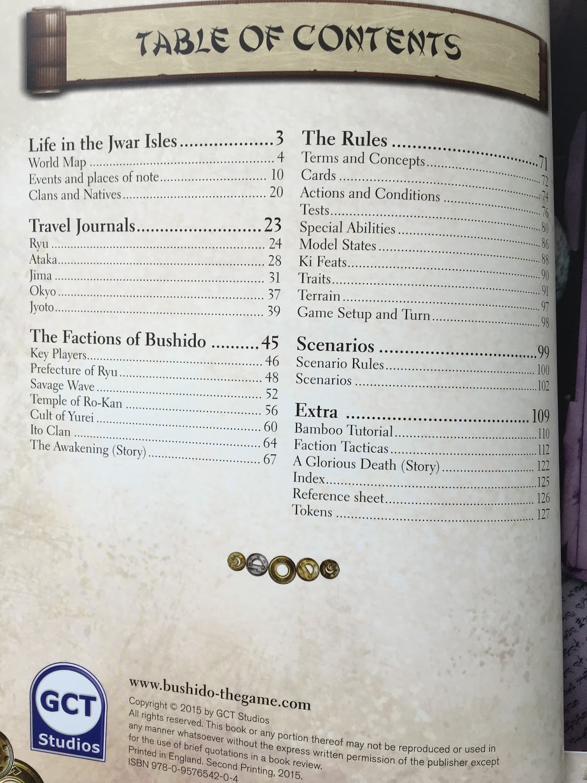 Das Bushido Regelbuch kommt als Softcover mit XXX Seiten daher. Es ist vollfarbig, mit einer matten, griffigen Papierqualität, ähnlich den Warmachine Forces of ... Büchern. Es liegt gut in der Hand und ist nicht rutschig. Der Einband ist aus festerem Papier.Inhaltlich ist das Buch wie hier zu sehen aufgeteilt. Zuerst wird einem die Welt der Jwar-Inseln vorgestellt, dann folgt eine detaillierte Beschreibung der Fraktionen, die Regeln und schließlich einige praktische Basteltipps. Getrennt werden die Kapitel von tagebuchartigen Schriften, die von den finsteren Plänen des Cult of Yurei berichten.