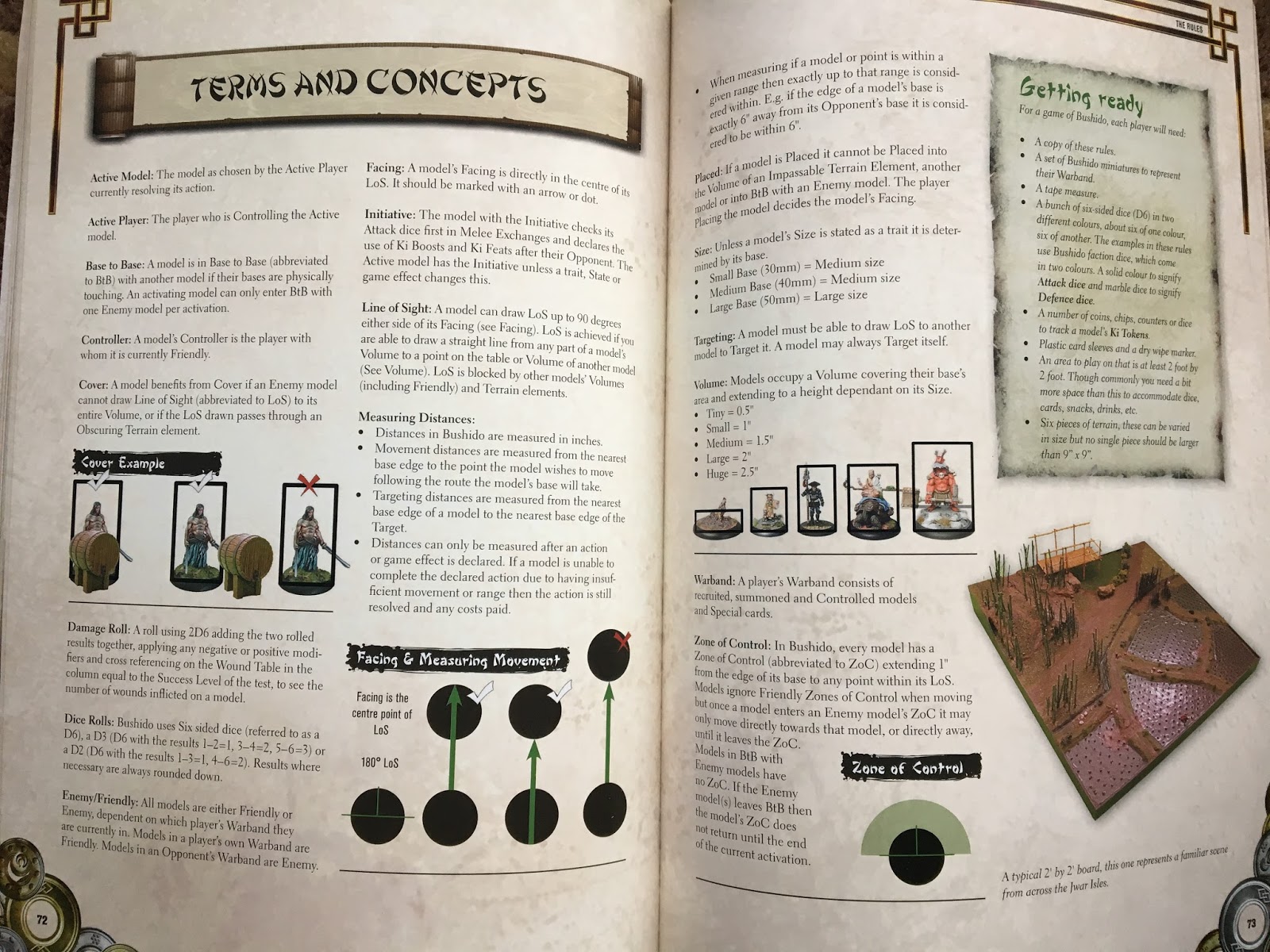 Das wahrscheinlich wichtigste Kapitel des Regelbuchs. Zuerst gibt es die übliche Erklärung von wichtigen Begriffen, wie zu Messen ist und wann ein Modell in Deckung ist. Welcher Wert wo auf den Karten zu finden ist wird gezeigt und eine Liste der möglichen einfachen und komplexen Aktionen wird gegeben. Dann wird auf mehreren Seiten das Abhandeln von Nah- und Fernkampf beschrieben, bevor es zu den Zaubern, pardon, Ki Feats geht. Als Abschluss werden dann noch alle Sonderregeln beschrieben.