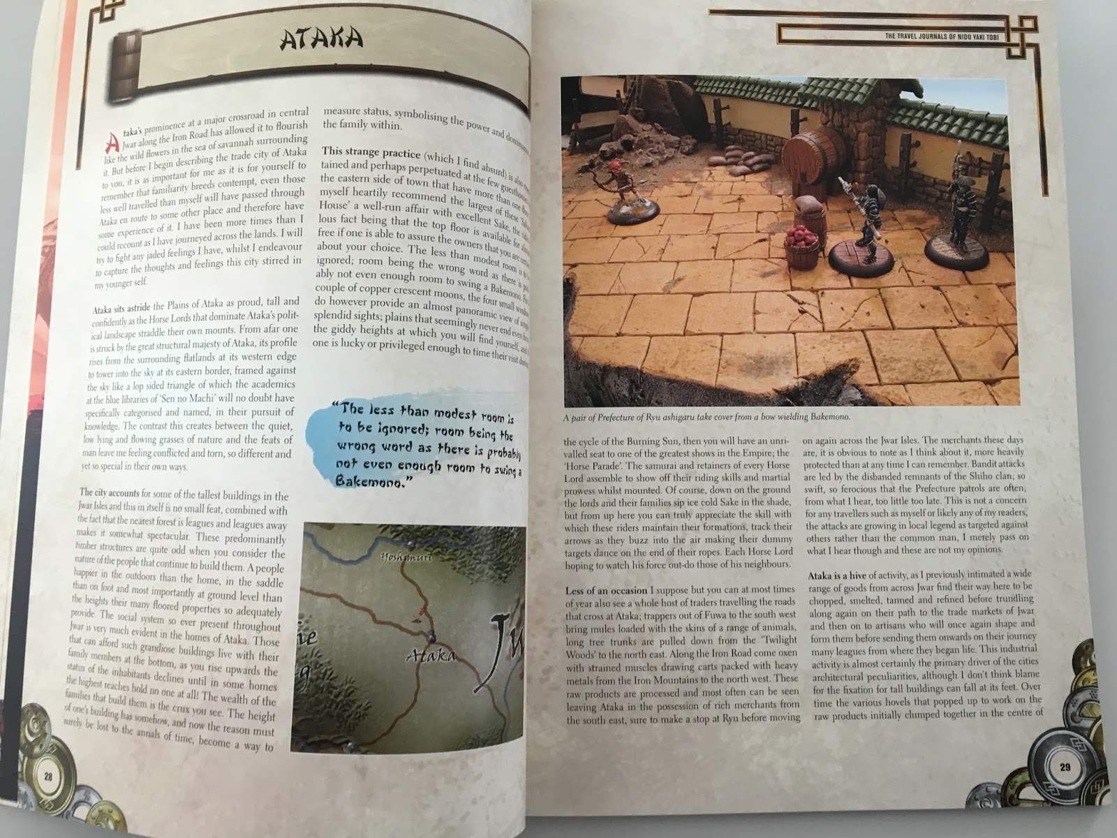 Hier kommt mein Lieblingsteil des Hintergrunds. Die Reiseberichte von XXX. Sehr schön geschrieben werden uns wichtige Städte und Orte aus seiner Sicht vorgestellt. Die Städte der großen Clans werden nicht nur beschrieben sondern man erhält auch Einblick in politischen Angelegenheiten der Clans. Es gibt sogar eine kleine Geschichte über den Minimoto Clan, die bärigen Herren von Jyoto. Doppelt verwunderlich, dass die Minimoto (noch) keine spielbare Fraktion sind.Jedes dieser Unterkapitel ist versehen mit Landkartenausschnitten, schönen Zeichnungen und hübsch in Szene gesetzten Miniaturen.
